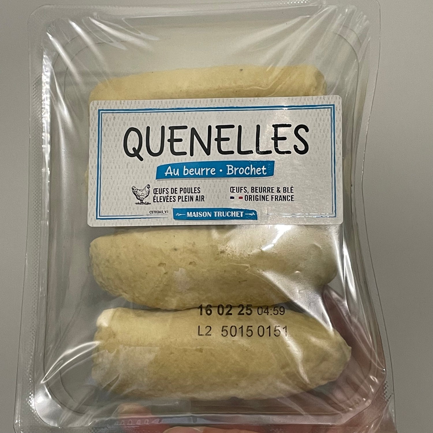 Ingrédients : œufs 30%, chair de brochet 20%, semoule de blé dur 16%, eau, beurre 11%, lait entier, sel